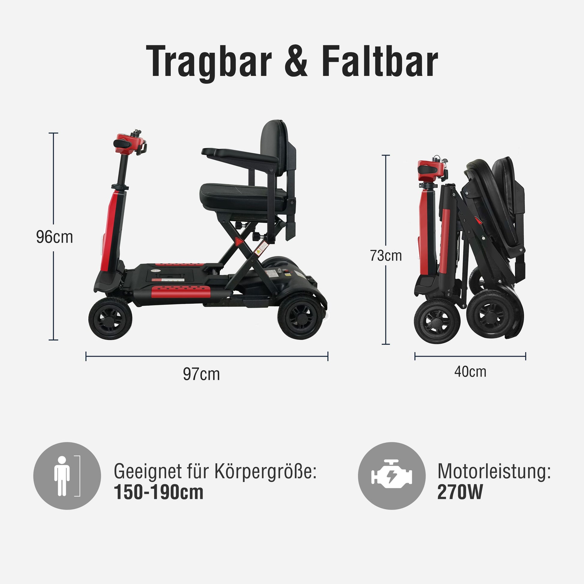 Die stabile 4-Rad-Konstruktion aus Aluminiumlegierung sorgt für sicheren Stand bei gleichzeitig geringer Breite von nur 49 cm. Mit einem Wendekreis von 115 cm meistert das Mobil selbst enge Gänge oder Aufzüge – perfekt für den Einsatz in Innenräumen und auf schmalen Wegen im Freien.