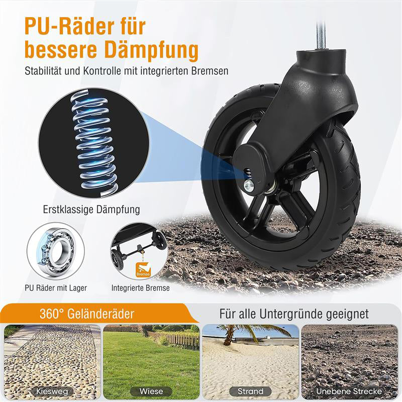 Dank der werkzeuglosen Montage der hochwertigen PU-Räder ist der Bollerwagen im Handumdrehen einsatzbereit. Die robusten Reifen mit Stoßdämpfung sorgen für eine sanfte und geräuscharme Fahrt – selbst auf unebenem Terrain. So genießen Sie maximale Flexibilität bei jeder Nutzung.