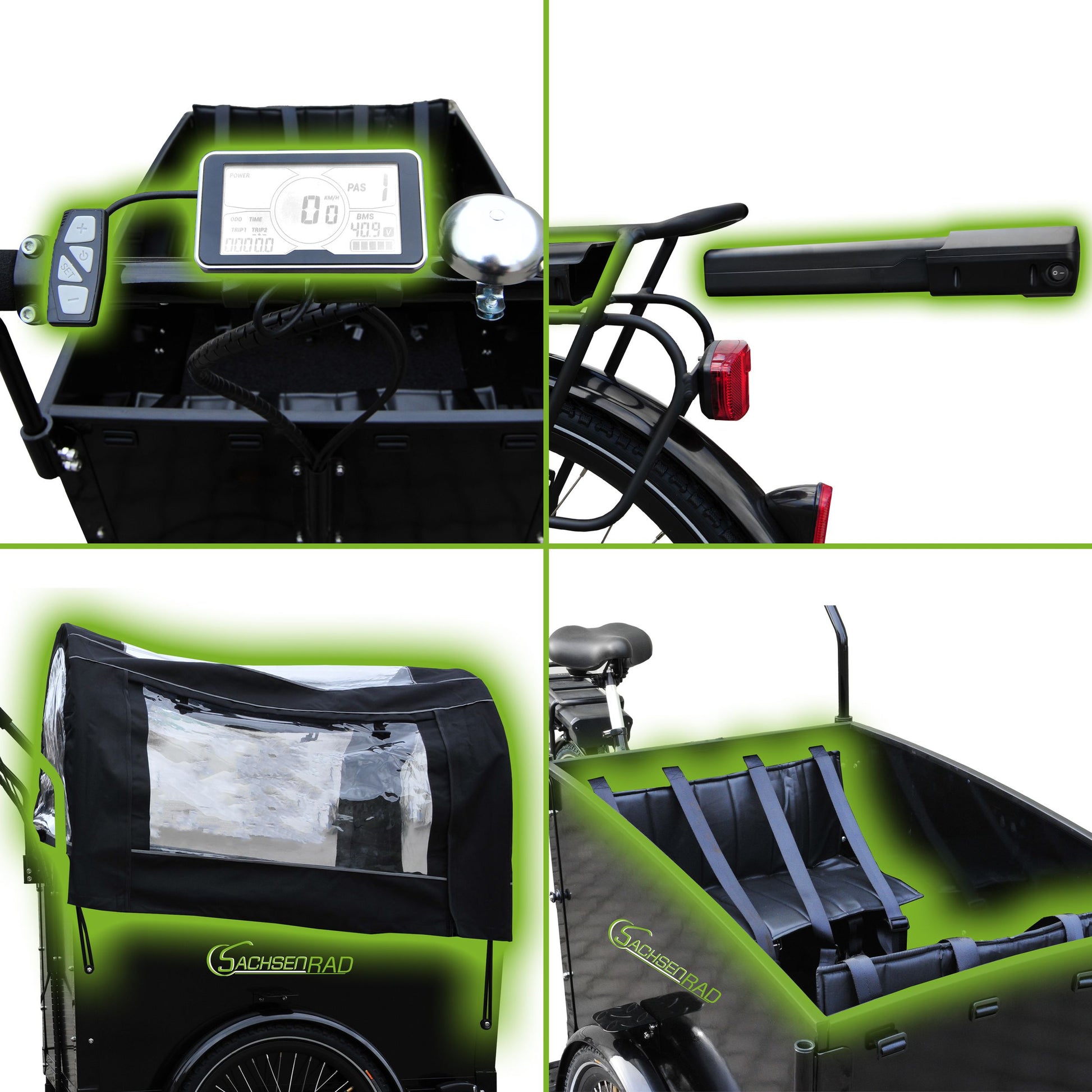 Vorder- und Rücklicht LED, Transportbox, Abdeckung mit Sichtfenstern, Sitzpolster, LCD-Steuerdisplay, Fahrmodus Pedelec, Alarmanlage