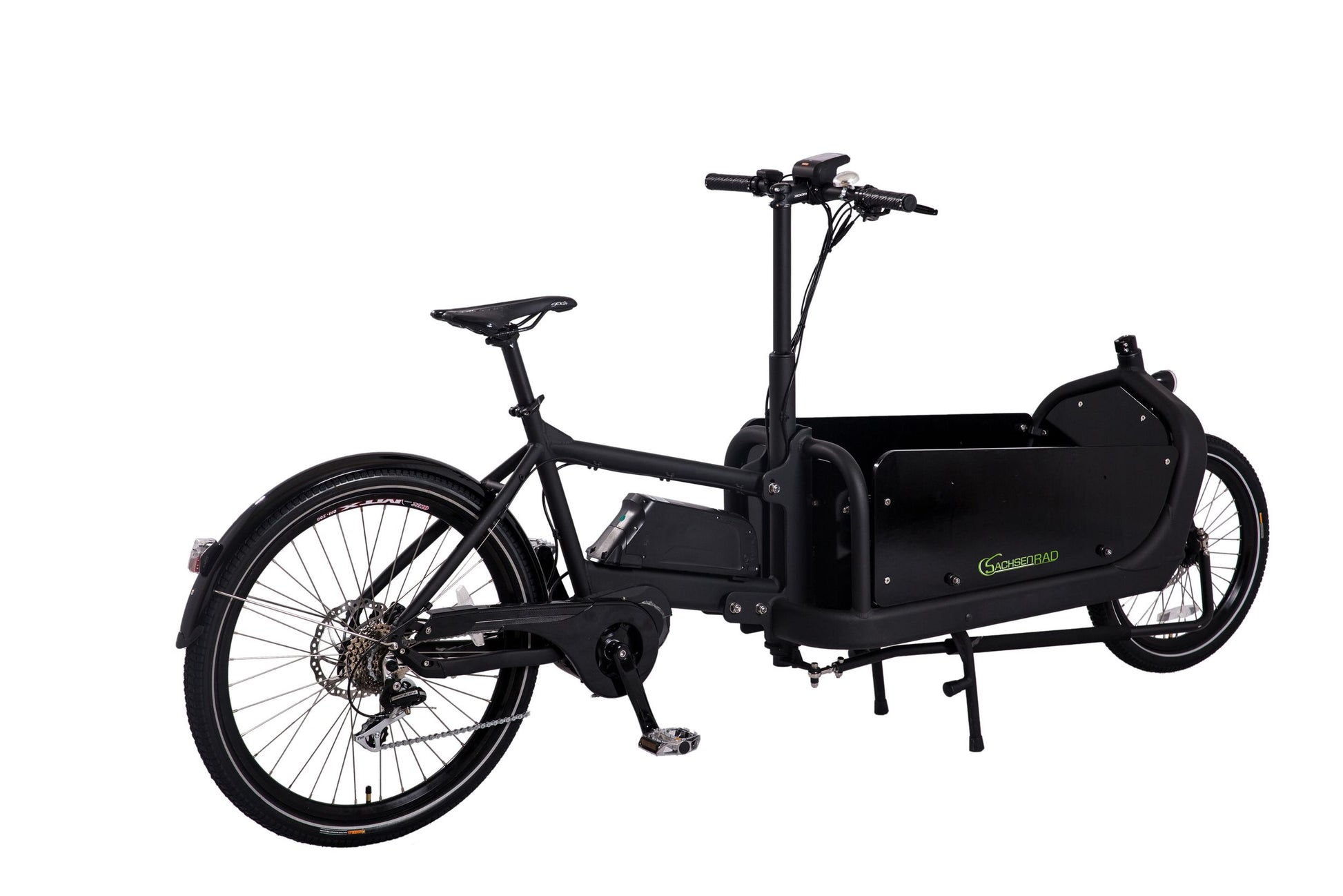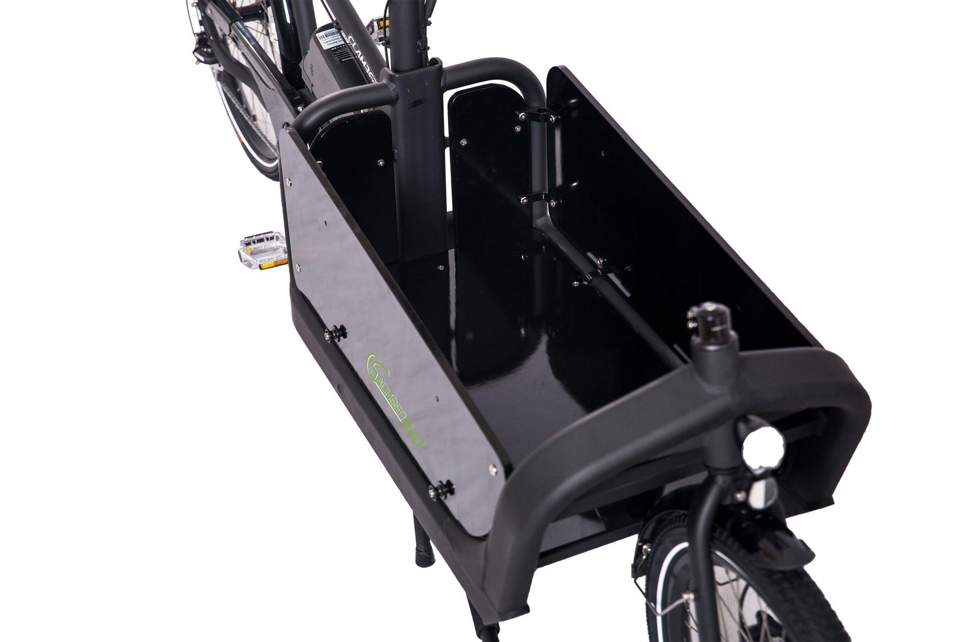 mit optionaler Regenabdeckung, Gepäckträger, LCD-Steuerdisplay von Bafang, Fahrmodus Pedelec, LED-Frontlicht / Rücklicht, Schutzblech, Holzkiste ohne Kindersitz und Sicherheitsgurte