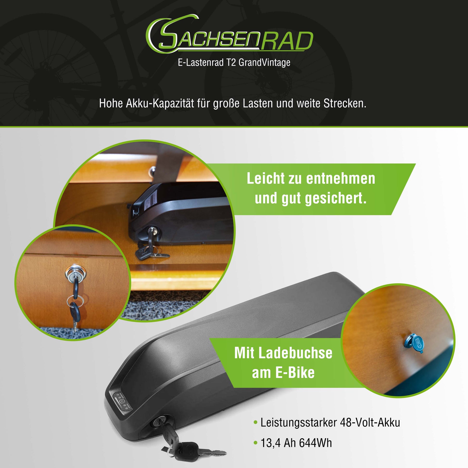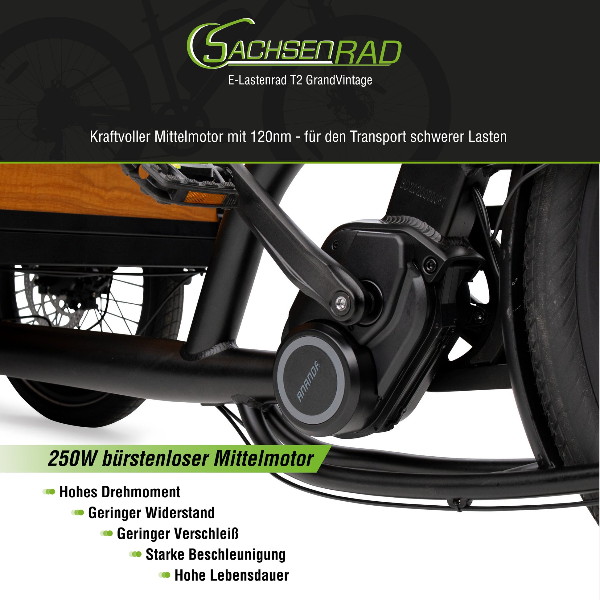 Das Elektro-Lastenrad T2 Grand Vintage von SachsenRAD wird von einem leisen und leistungsfähigen 48-Volt-Motor mit 250 Watt und Schrittsensor angetrieben. Dank seines bärenstarken 120 Newtonmeter Drehmoment übertrifft das Grand Vintage viele vergleichbare Lastenradmodelle auf dem Markt. Die hohe Kapazität der Batterie bietet Ihnen eine Reichweite von 50 bis 80 km mit nur einer einzigen Aufladung.
