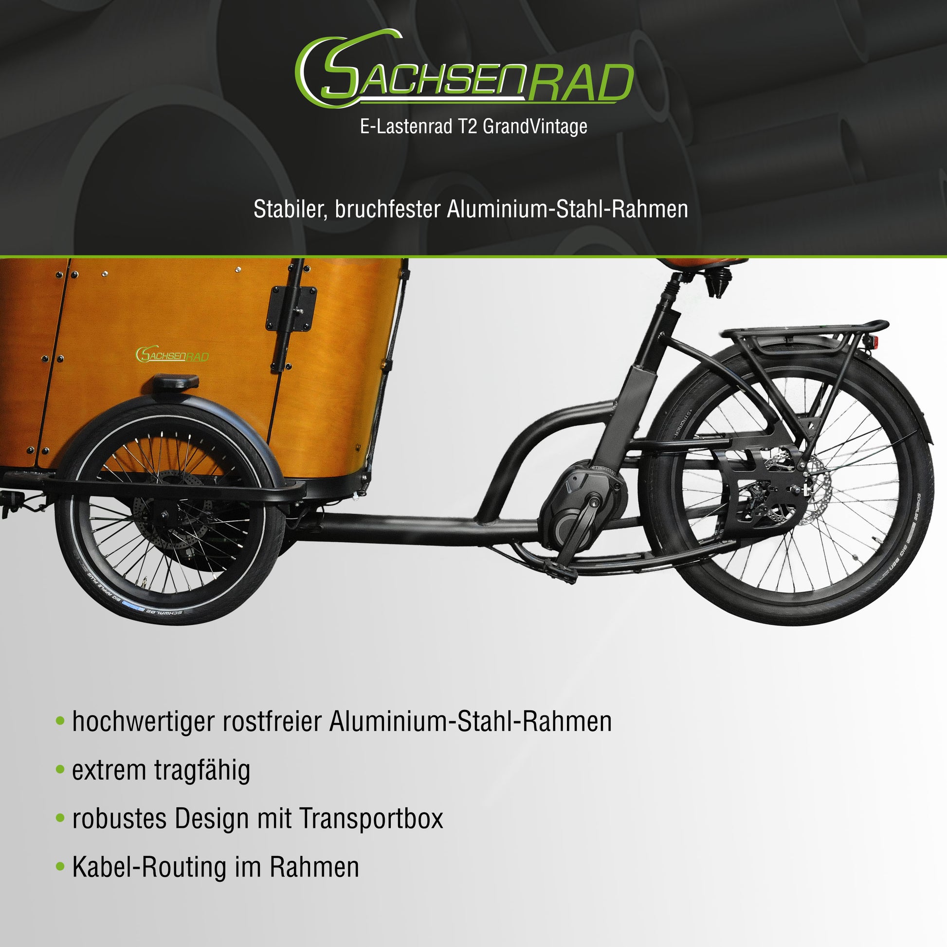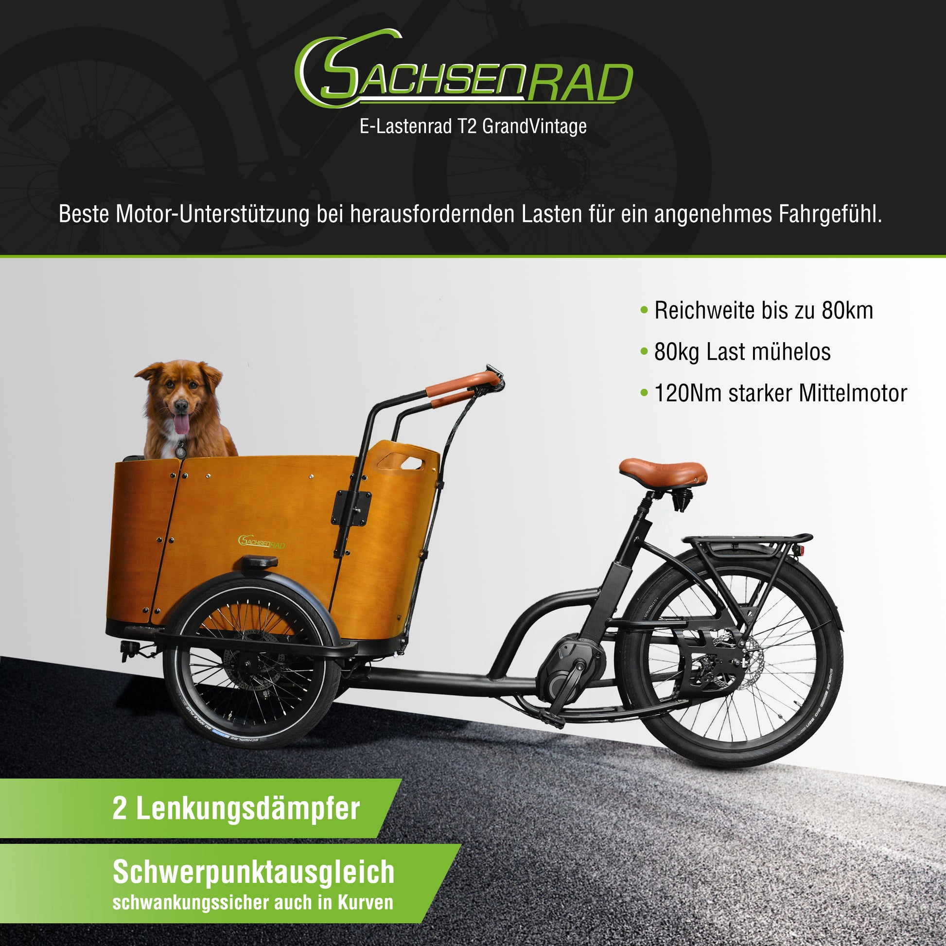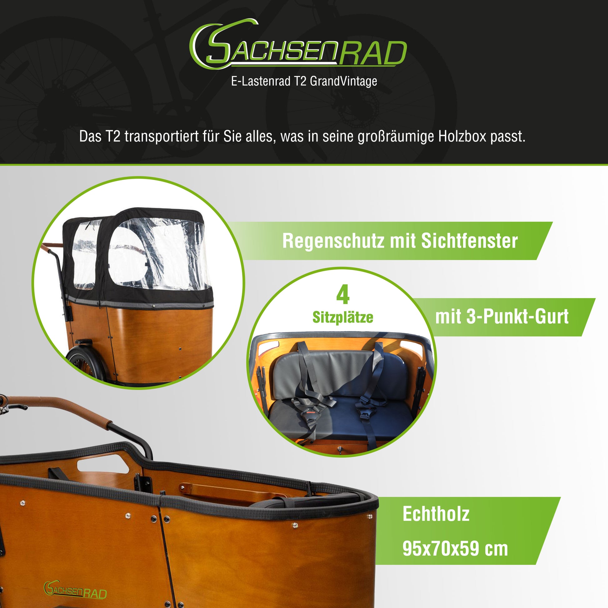 Das SachsenRAD T2 Grand Vintage bringt Sie und Ihre Kinder spielend einfach, sicher und schnell von A nach B. Unser Lastenrad ist der optimale und preisgünstige PkW-Ersatz in der Stadt.