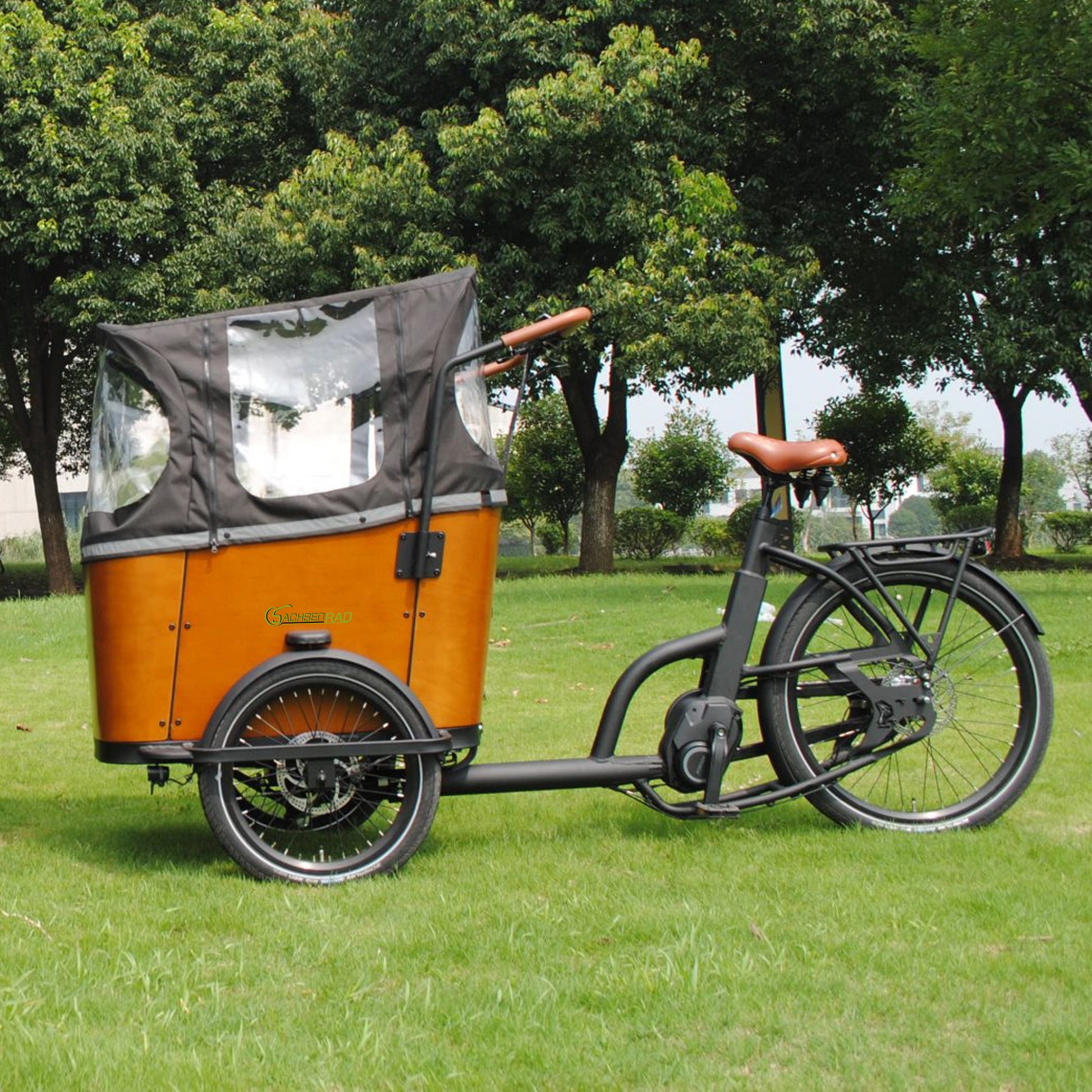 Das Lastenfahrrad Grand Vintage bietet bis zu 4 Plätze für Kinder, den großen Wocheneinkauf oder dem voll gepackten Ausflug an den Badesee. Es ist außerdem mit einem Verdeck ausgestattet, das Ihre Lieben vor Regen, Sonne und Staub schützt. Sie können es je nach Bedarf auf- und abmontieren.