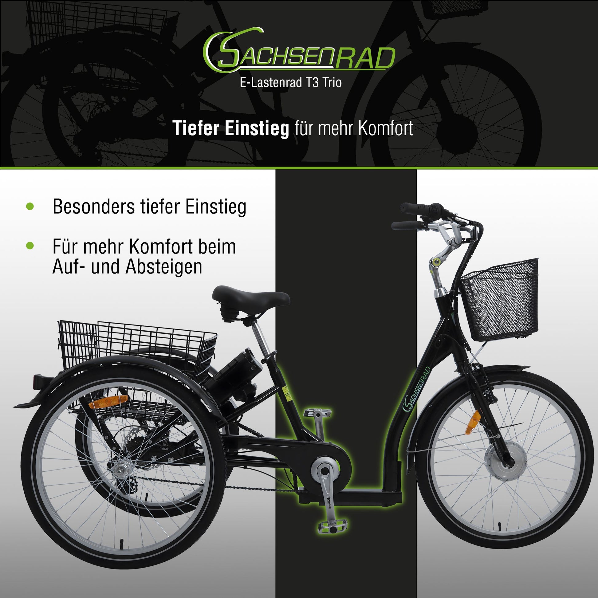 Wenn Sie sich mit großen Lastenrädern etwas unsicher fühlen, aber trotzdem gerne fest und stabil im Sattel sitzen, dann bringt sie das SachsenRAD T3A Trio zuverlässig und sicher durch die Stadt. Die drei 24" Räder mit Markenreifen von KENDA bewahren Sie vor Stürzen und lassen Sie mühelos durch den Verkehr steuern, ganz egal wie hektisch er ist. Ein weiteres Highlight ist der tiefe Einstieg, der Sie problemlos auf- und absitzen lässt.