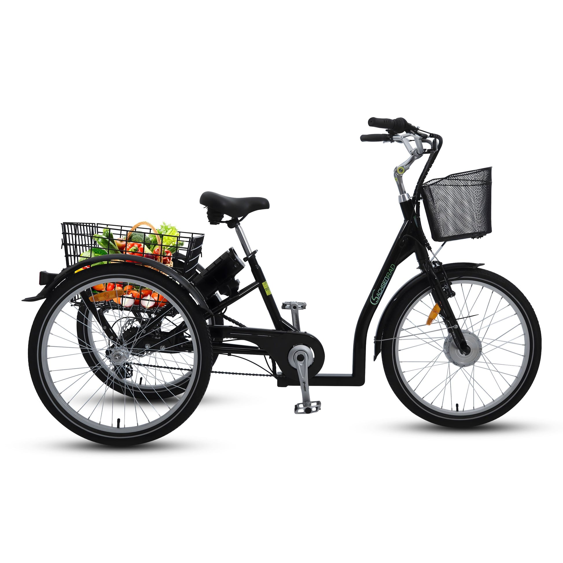 drei Räder, Lastenkorb, Lenkerkorb, LCD-Steuerdisplay, Fahrmodus Pedelec, LED-Frontlicht, Alarmrücklicht mit integriertem Bremslicht, Schutzblech, Ledersattel