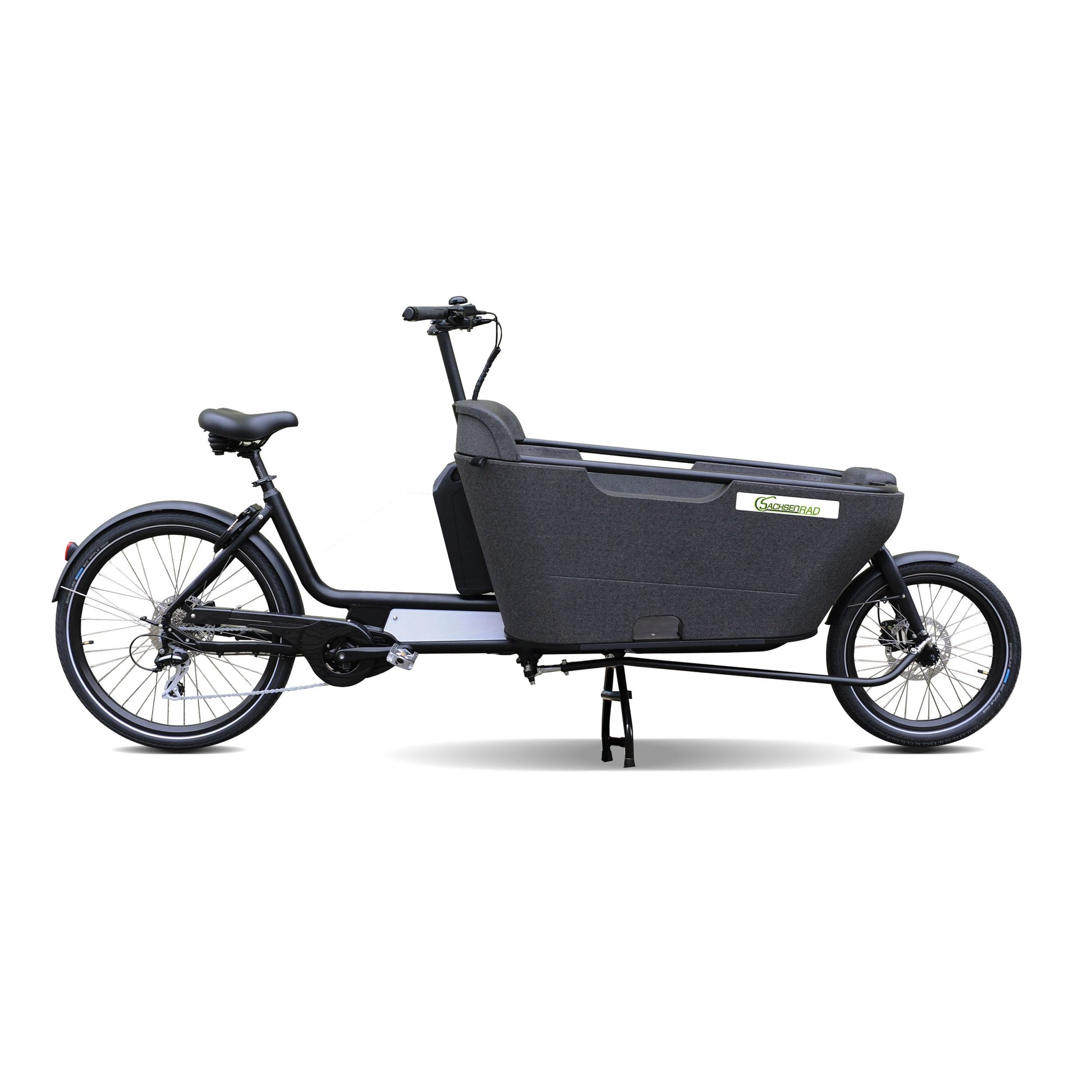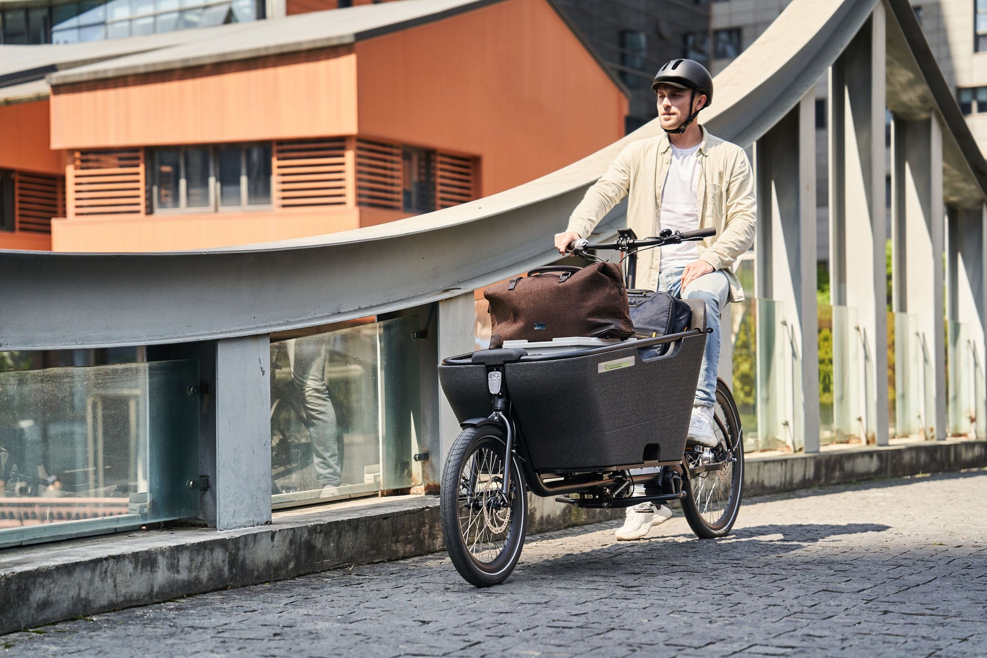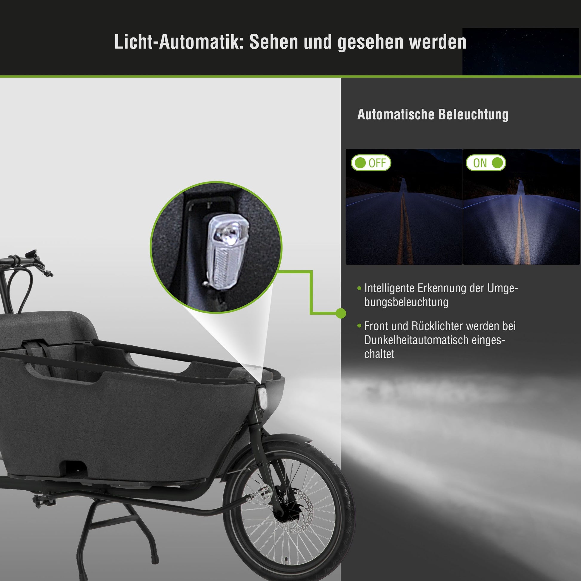 Dank der automatischen Beleuchtung bleibt das Lastenrad auch bei Dämmerung oder in der Nacht gut sichtbar, ganz ohne manuelle Aktivierung.