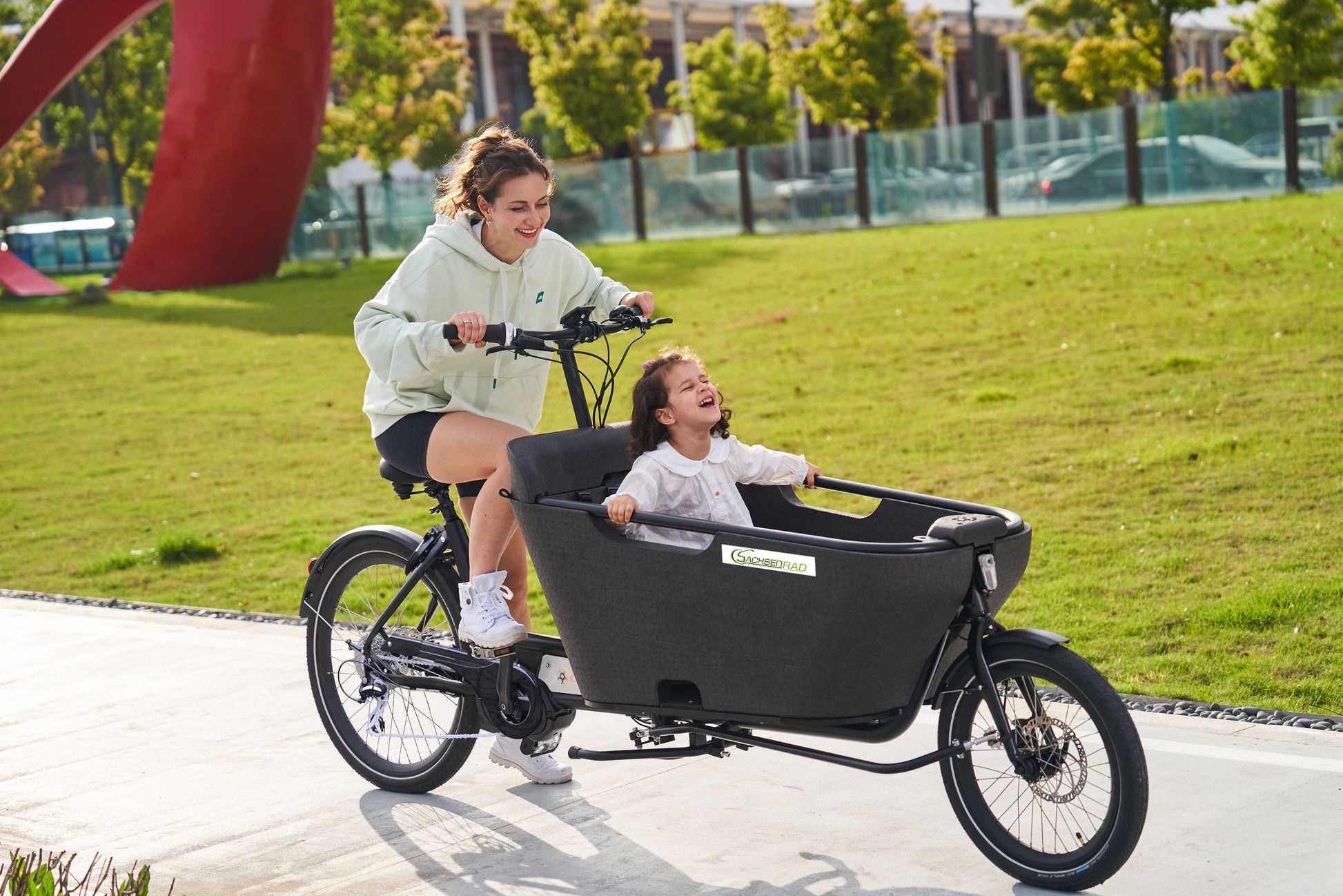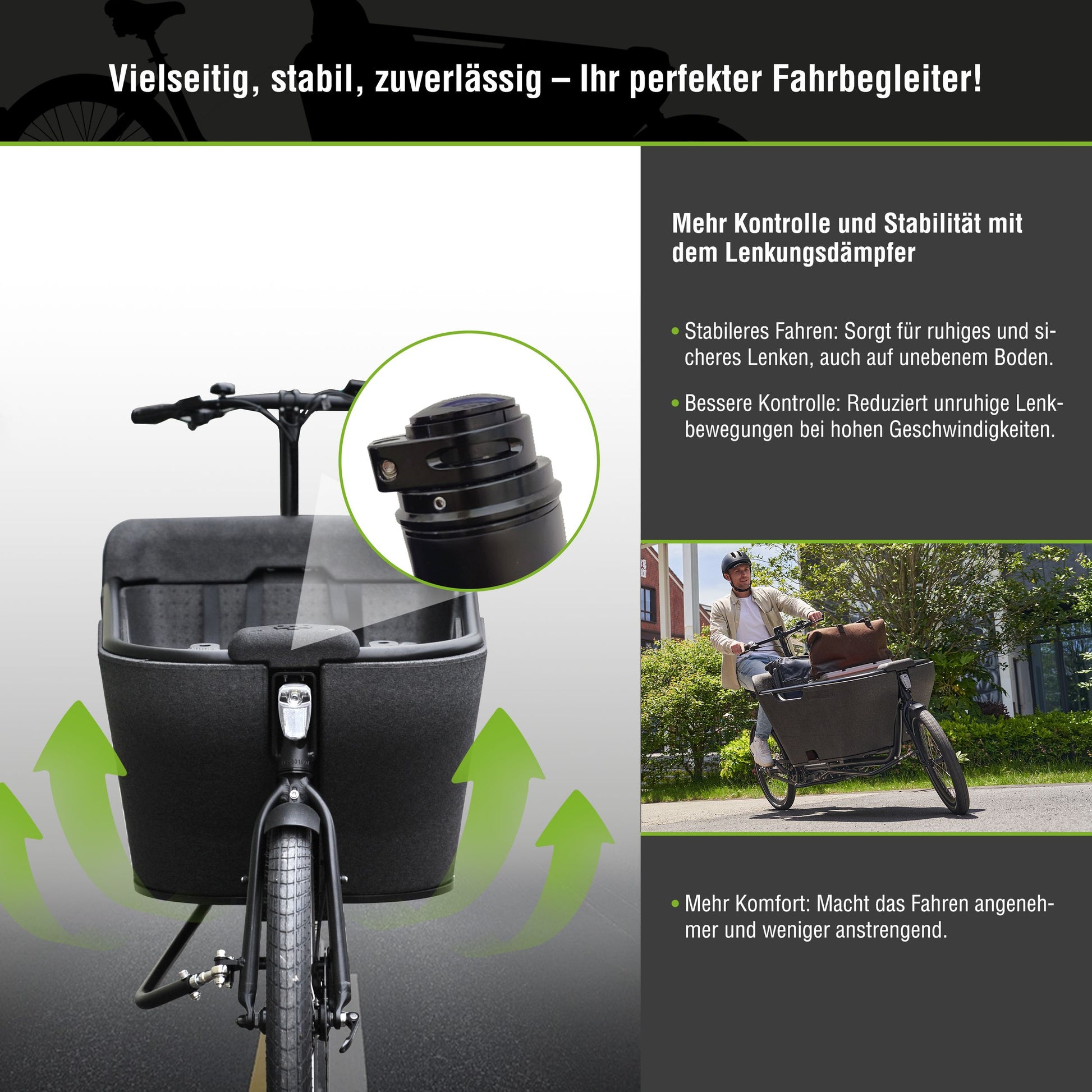 Für den nötigen Komfort sorgt ein speziell entwickelter, kinderfreundlicher Sitz mit 3-Punkt-Sicherheitsgurt. Ein Lenkungsdämpfer minimiert Erschütterungen auf unebenen Strecken und sorgt für ein stabiles, ruhiges Fahrverhalten – selbst bei voller Beladung.